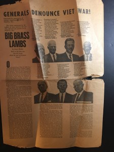 The second is a full-page broadside, a reprint of an anti-Vietnam essay originally published in Esquire. Both are bruised with age: brownish, yellowish, brittle.