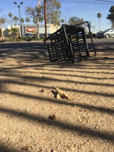 Set against the extinguished rage represented by the morning’s overturned shopping cart is the rage of local homeowners. In my neighborhood there are many who hate – passionately and whole-heartedly hate – people on the streets. They share their vitriol on neighborhood networks and on local-interest blogs. They accumulate lots of likes and thumbs-up and smileys and winkies. They’d like the city to just arrest anyone caught living in a camper, a tent, or a sleeping bag. They’d send them them to the Antelope Valley. Let Lancaster deal with them. If Lancaster and Palmdale complain, then just jail them.