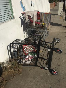 Even with new-ish theft-prevention systems – wheels that lock when the cart crosses the store’s invisible property line – shopping carts end up in all parts of the city. They are the U-Hauls of the addicted, evicted, abused, shamed, and unlucky. They’re symbols of the götterdämmerung we have feared for seventy years. In Cormac McCarthy’s The Road, survivors push shopping carts along abandoned interstates, eying one another fearfully – or hungrily.
