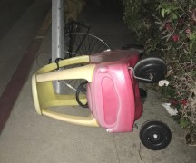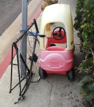 Five weeks ago, a carefully arranged still life appeared on a nearby street. It consisted of a bike frame, a rear wheel, and a toddler’s pedal car, all cable-locked to a power pole guy wire. It was all neatly done, the wheel and frame in vertical, snuggled against the child’s toy.